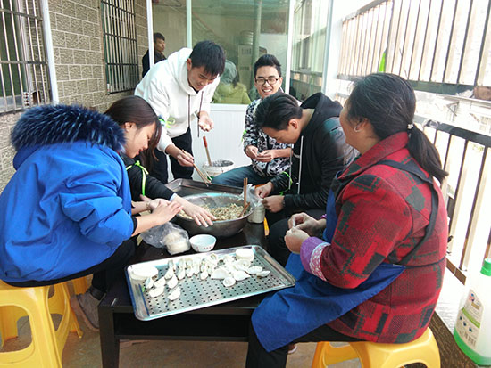 炊事組拿出提前備好的餃子餡和面團,熱熱鬧鬧地包起餃子。志愿者們嫻熟的拿起餃子皮,沾水、包餡、捏褶,準(zhǔn)備午飯。