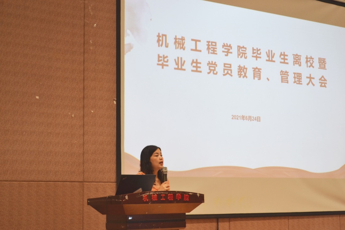 機(jī)械工程網(wǎng)站訊(記者 張江平|攝影 王若男)為扎實(shí)做好機(jī)械工程學(xué)院2021屆畢業(yè)生離校有關(guān)工作,加強(qiáng)對(duì)畢業(yè)生黨員的教育管理,機(jī)械工程學(xué)院于6月24日在機(jī)械樓圓形報(bào)告廳召開畢業(yè)生離校暨畢業(yè)生黨員教育管理大會(huì)。學(xué)院黨委副書記廖燁出席會(huì)議,學(xué)生科岑曉潔、何琳煜、王嘉斌老師及研究生科趙麗芳老師和全體畢業(yè)生參加會(huì)議。會(huì)議由趙麗芳主持。