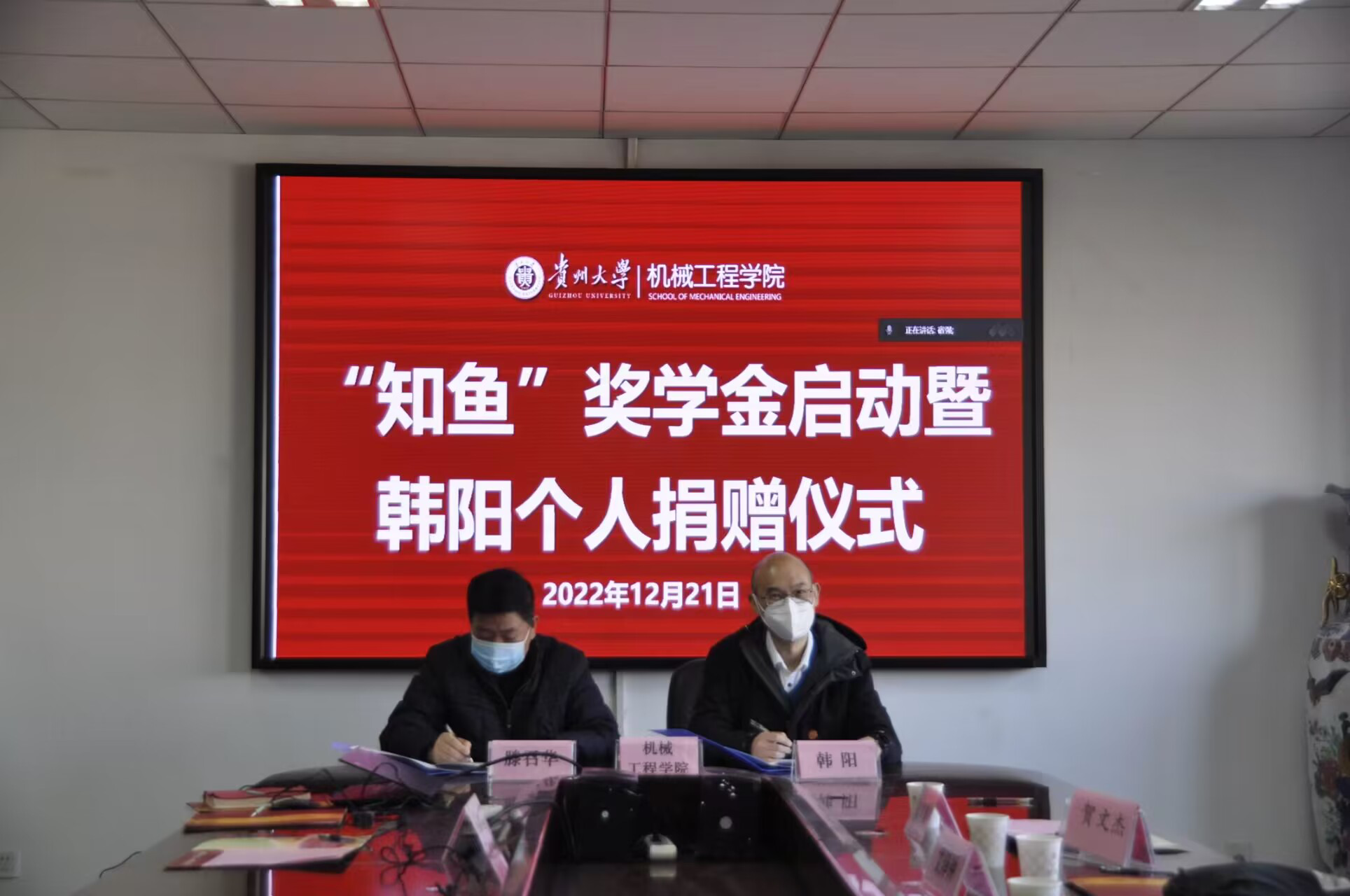 20221221日上午10時,貴州大學(xué)機(jī)械工程學(xué)院聯(lián)合貴州捷盛鉆具股份有限公司在518會議室舉辦了“知魚”獎學(xué)金啟動暨韓陽個人捐贈儀式。院黨委書記滕召華、院長趙津、副院長何峰、科研與對外合作辦主要負(fù)責(zé)人、各專業(yè)系室中心主任,學(xué)生代表出席了本次捐贈儀式。