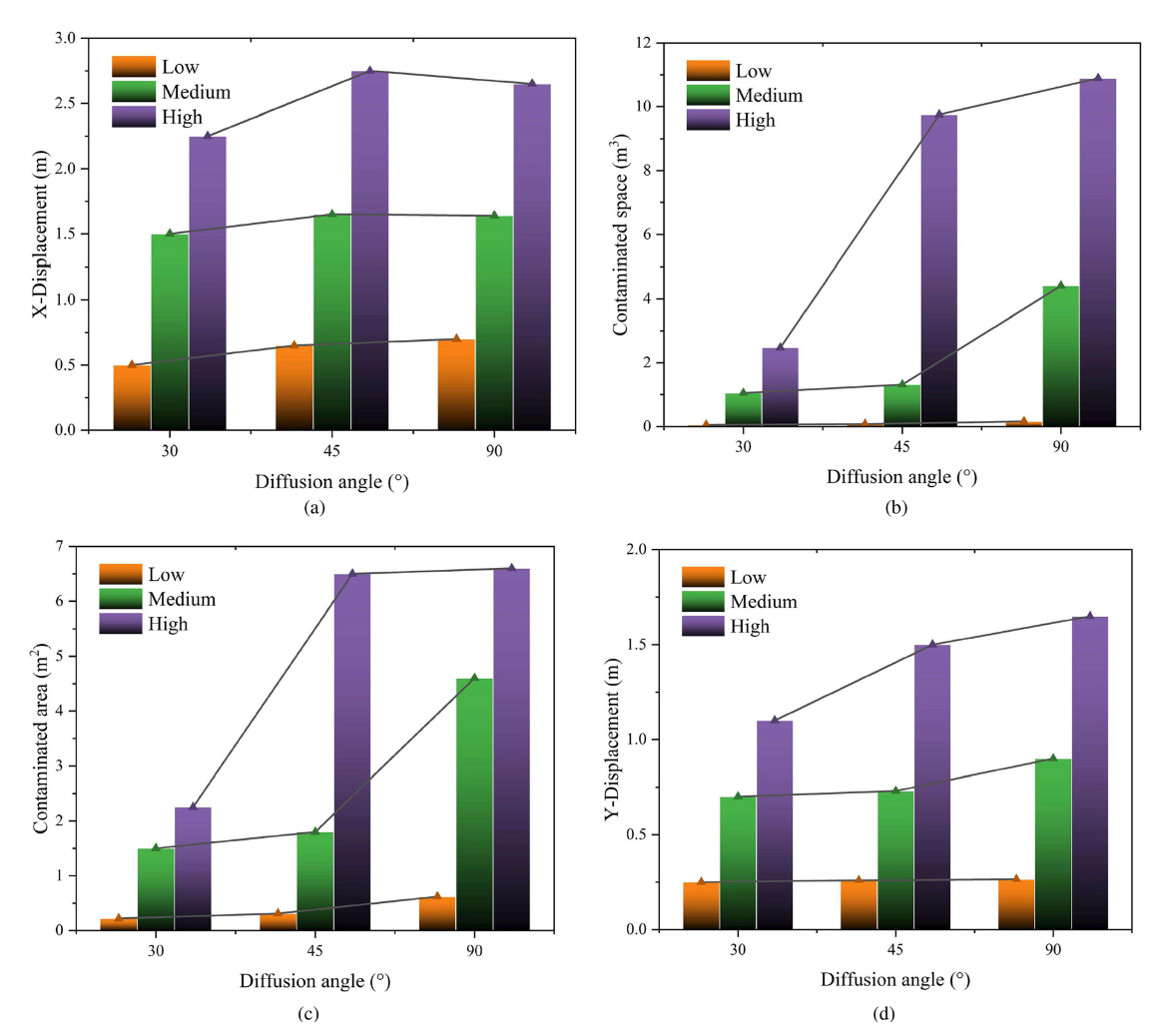 15. 超聲波除垢儀的三種工作條件和三種初始擴散角的不同組合對手術(shù)過程中大液滴顆粒的空間流動特性的影響粒子的空間流動特性的影響。(a) 飛濺距離的變化 (b) 污染空間的變化 (c) 飛濺沉積面積的變化 (d) 飛濺高度的變化。