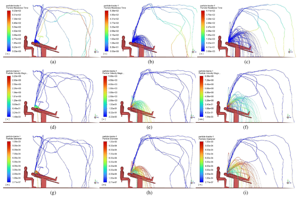 3. 案例 7-9 分別模擬了在大初始噴射角下使用低、中、高功率引發(fā)的液滴流動。(a)-(c) 液滴顆粒在空氣中的停留時間;(d)-(f) 不同粒徑的液滴顆粒在空氣中的停留時間;(d)-(f) 不同粒徑液滴顆粒的速度分布;(g)-(i) 液滴顆粒的粒徑分布;
