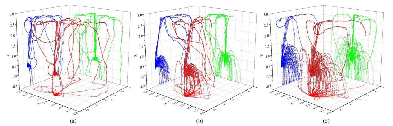 4. 案例 7-9 分別模擬了在大初始噴射角下使用低、中、高功率引發(fā)的液滴流動。(a) 液滴的初始噴射速度為 2 /秒、液滴的初始噴射角為 90;(b)液滴的初始噴射速度為 5m/s,液滴的初始噴射角為 90;以及(c)液滴的初始噴射速度為 8m/s,液滴的初始噴射角為 90。液滴的初始噴射角為 90