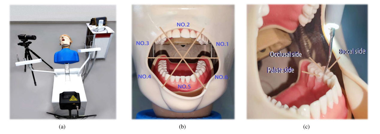1. (a) 實驗場景示意圖,包括粒子測速設(shè)備、人體模型和超聲波潔牙機;(b) 口腔牙齒分區(qū)示意圖,其中口腔內(nèi)的牙齒被分為六個主要區(qū)域;(c) 單顆牙齒分區(qū)示意圖,其中每顆牙齒被分為三個表面。(c) 單顆牙齒的分區(qū)圖,其中每顆牙齒分為三個表面、腭面、頰面和咬合面;