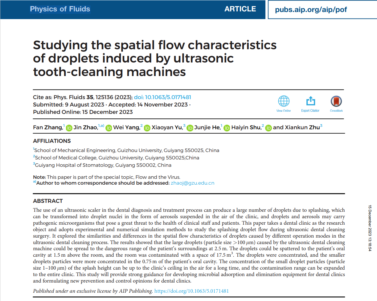貴州大學機械學院趙津教授、醫(yī)學院楊威教授貴陽市口腔醫(yī)院余曉燕主任共同組成課題組在口腔超聲潔牙手術(shù)中噴濺飛沫流動特性研究方面取得進展