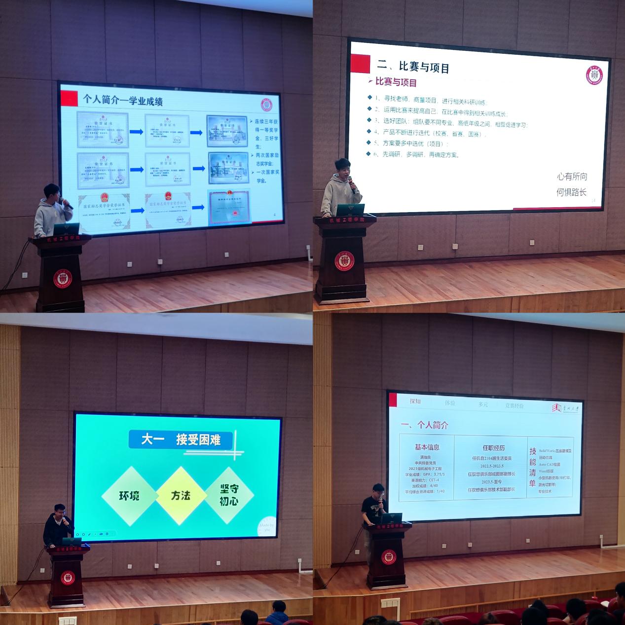 分享會上,4名國家獎學金獲得者周鑫、王路凱、楊懷誠、滿珈良從個人發(fā)展規(guī)劃、學習經(jīng)歷、科研競賽、社會實踐等方面分享經(jīng)驗。周鑫同學重點分享了保研、科研競賽“干貨”,建議同學們做好學業(yè)規(guī)劃,積極參加各項科研競賽,扎實專業(yè)知識。王路凱同學就如何提升專業(yè)能力、如何平衡學習和生活,分享專業(yè)必備軟件與技能、參賽經(jīng)驗、成果轉(zhuǎn)化、情緒調(diào)節(jié)等tips。楊懷誠同學結合自身規(guī)劃發(fā)展,建議同學們從大一開始盡快適應環(huán)境,打好基礎,大二專注提升理論和實踐,爭取大三鉆研出成果。2名國家勵志獎學金獲得者楊小彬、金別樹解讀國家勵志獎學金評選條件,鼓勵同學們合理規(guī)劃學習時間,利用互聯(lián)網(wǎng)、圖書館等學習資源擴大知識面和深化理解,保持良好身心健康。