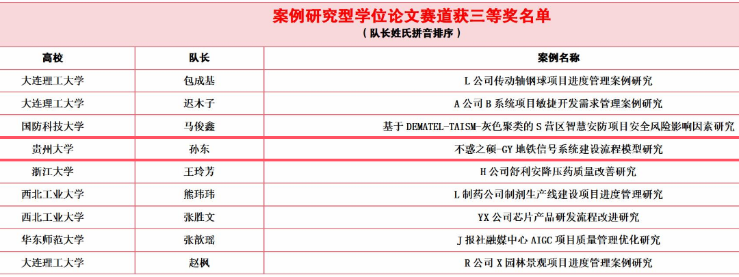 比賽設六個平行“主題賽道”。學院首次嘗試指導工程管理專業(yè)學生參賽,選擇了“案例研究型學位論文”賽道。參賽期間我院梅益教授、楊觀賜教授和李少波教授等指導工程管理專業(yè)學生不斷打磨論文。2021級工程管理專業(yè)孫東同學的論文《GY地鐵信號系統建設流程模型研究》獲得全國三等獎,實現了工程管理重大賽項零的突破。