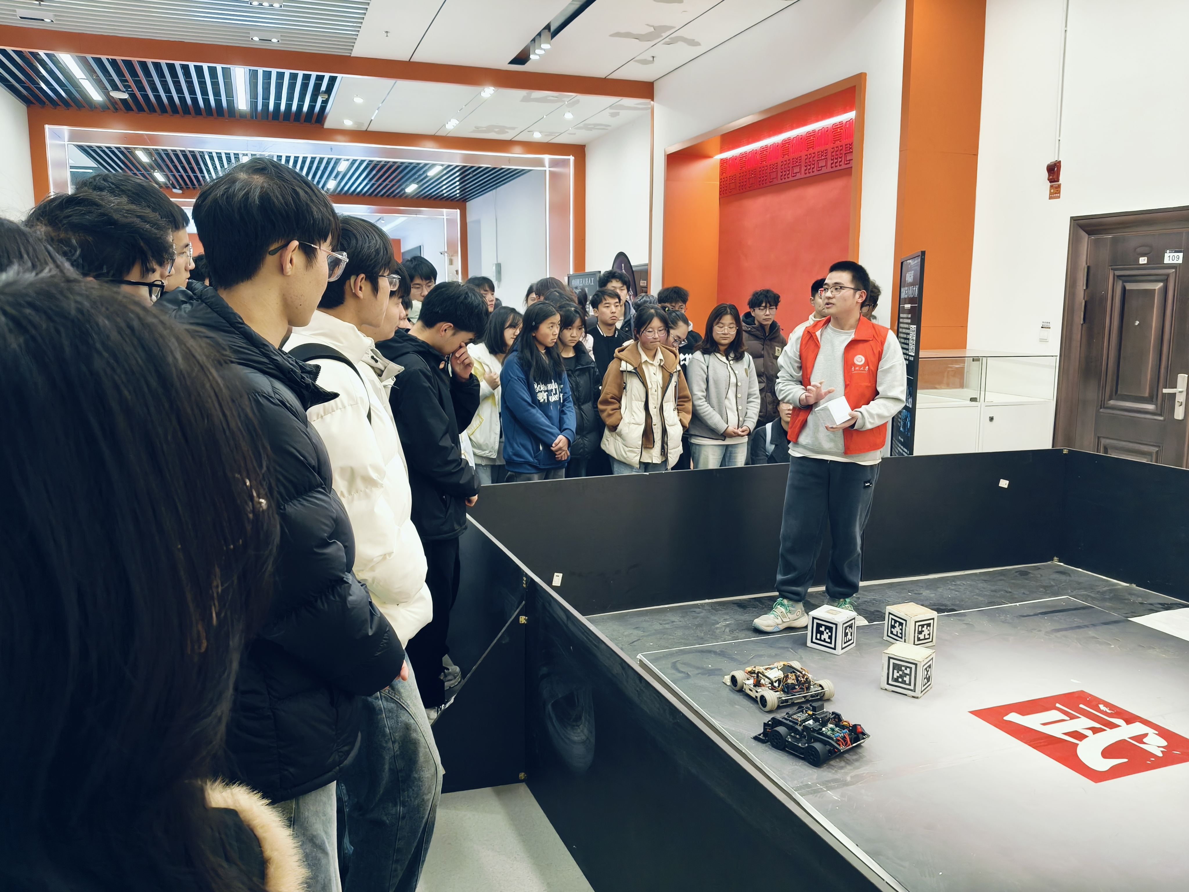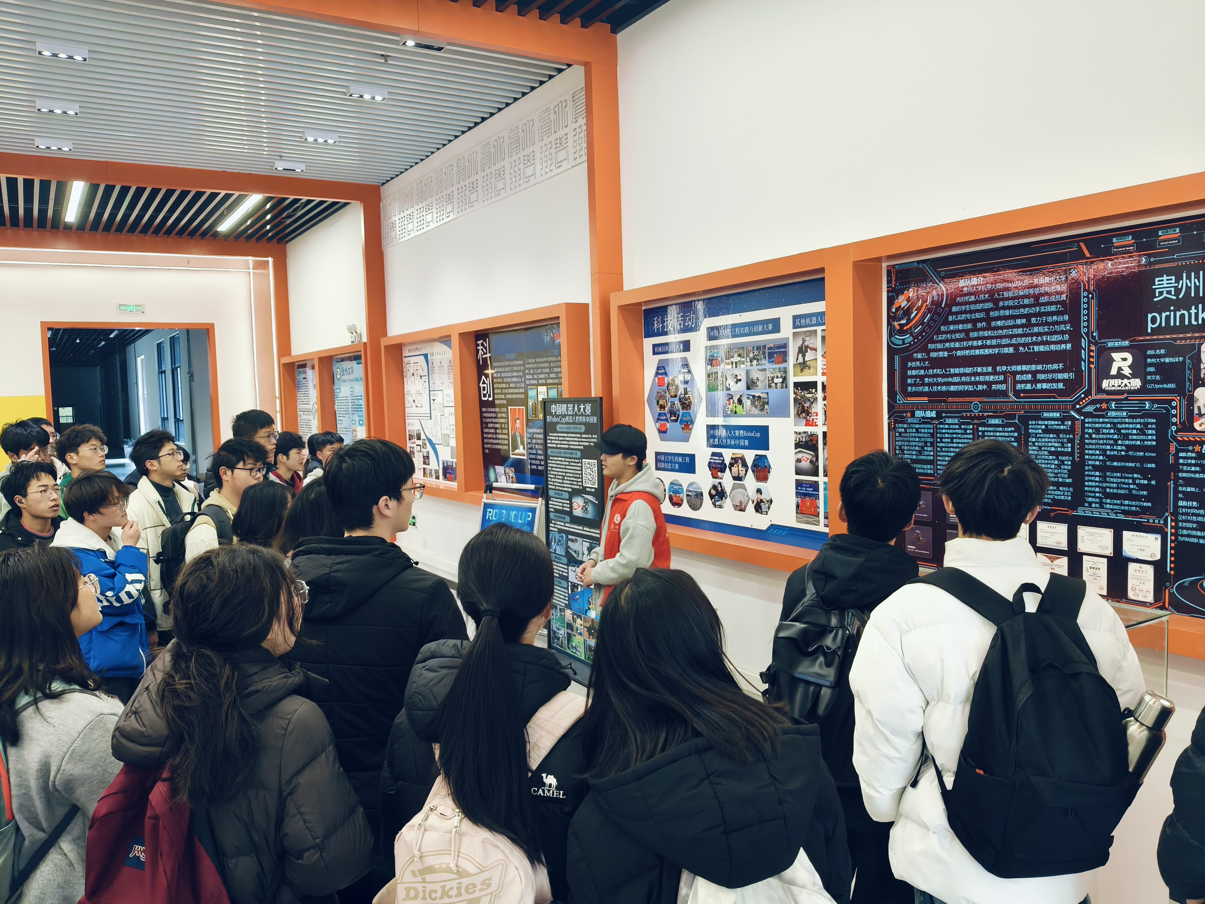 正式介紹優(yōu)秀作品前,馭想俱樂部負責(zé)人楊春白雪向同學(xué)們介紹習(xí)近平總書記給中國國際大學(xué)生創(chuàng)新大賽參賽學(xué)生代表回信內(nèi)容。隨后楊春白雪和機器人社團負責(zé)人田景怡分別對兩個科創(chuàng)社團進行了介紹并對相關(guān)賽事進行解讀,還向大家展示了貴州大學(xué)代表隊的獲獎作品。在參觀robomaster工作室時,獎杯墻令人震撼。同學(xué)們表示一個個獎杯背后的故事更令人欽佩,激勵機械青年守正創(chuàng)新,再創(chuàng)佳績。