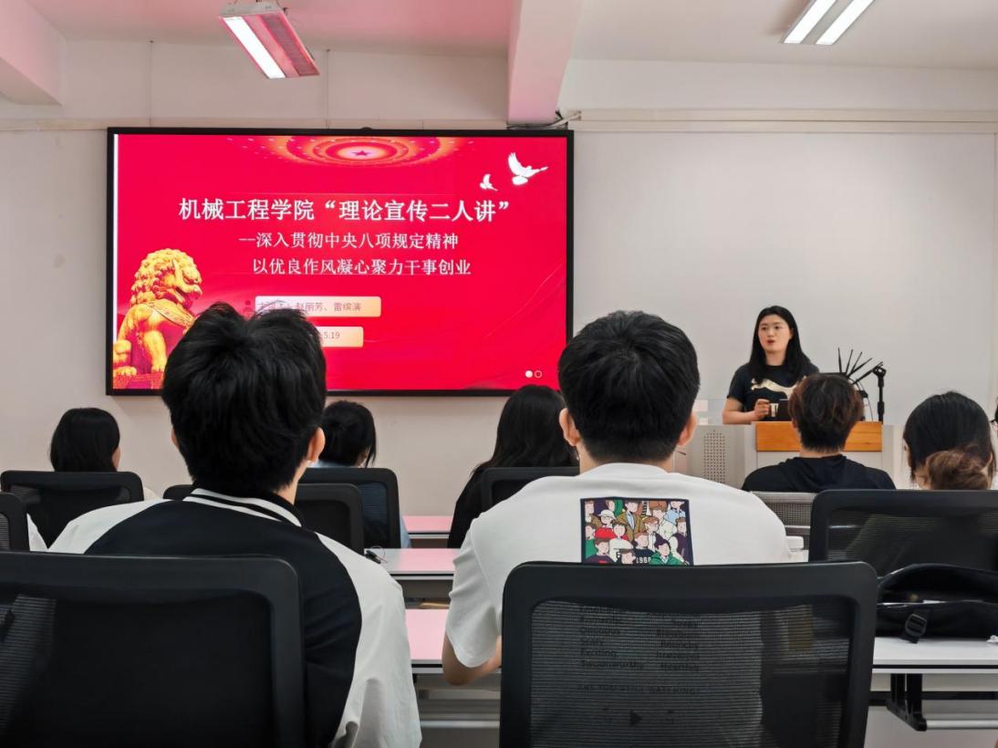為深入貫徹中央八項規(guī)定精神學(xué)習(xí)教育,以優(yōu)良作風(fēng)凝心聚力干事創(chuàng)業(yè)。519,機械工程學(xué)院本科生第三黨支部以中央八項規(guī)定為學(xué)習(xí)主題,開展“理論宣傳二人講”活動。