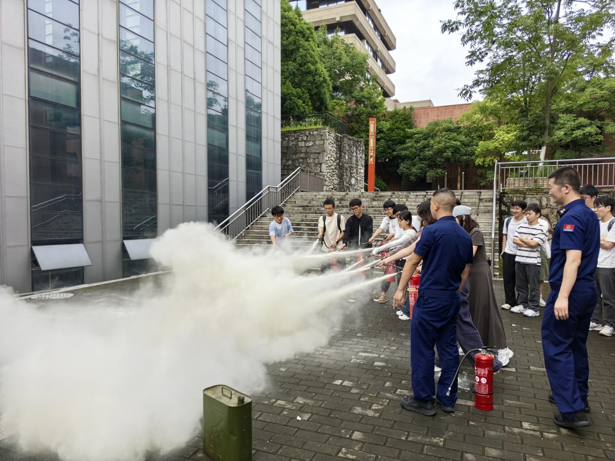 培訓現(xiàn)場還組織同學們開展了應急演練,通過以滅火器的使用為例,鞏宇峰秦榮東演示滅火器的使用步驟:一看、二提、三拔、四瞄、五壓噴,指導了同學們使用滅火器撲滅模擬火源,從準確判斷風向、與火源保持安全距離,到拔保險銷、握住噴管、對準火焰根部按壓噴射,同學們準確掌握了滅火器的使用方法。