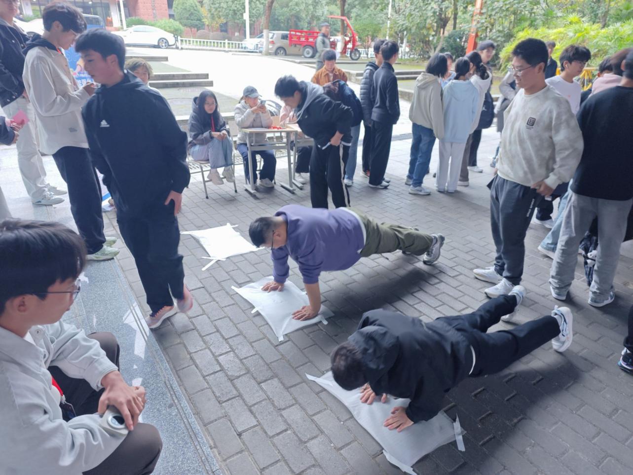 運動會圍繞“臂力訓(xùn)練”與“腿部爆發(fā)力訓(xùn)練”為兩大核心,設(shè)計了五項趣味性十足又充滿挑戰(zhàn)的活動,以小組為單位展開。在“堅持到底”懸吊挑戰(zhàn)中,男生們通過使用TRX懸掛帶或單杠比賽懸垂時間,女生則以TRX平板支撐展示耐力,30秒到80秒之間不同的積分等級激發(fā)了學(xué)生們的極限潛能;“推陳出新”趣味俯臥撐大賽里,男生們按需完成不同形式的俯臥撐關(guān)卡,動作標(biāo)準(zhǔn),節(jié)奏穩(wěn)健,盡顯運動風(fēng)采。